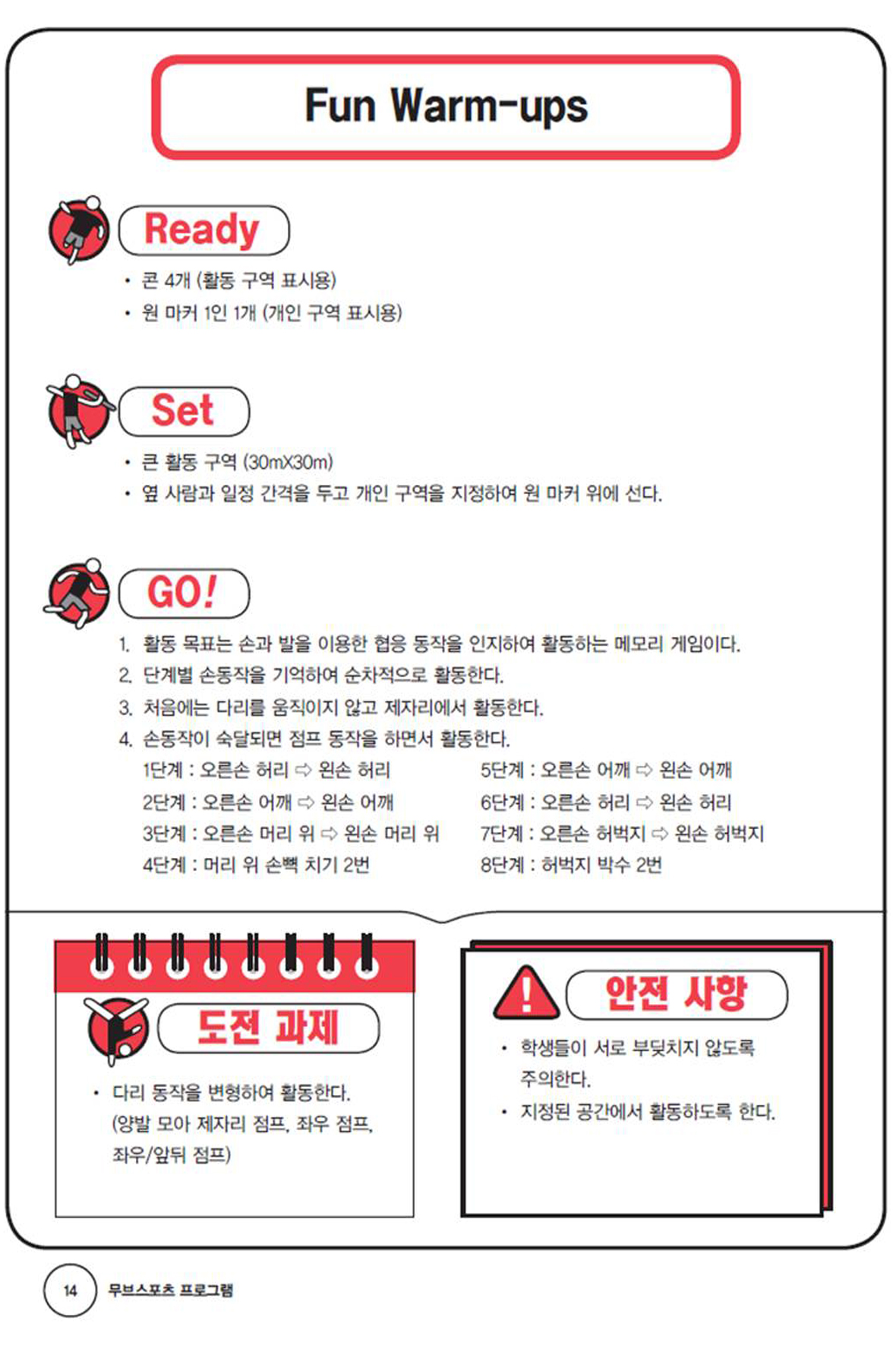 리드업 게임은 다양한 신체활동을 도전/협동/경쟁 요소를 포함한 활동으로 학생들이 짧은 시간에 쉽고 즐겁게 참여 가능한 준비운동 게임입니다