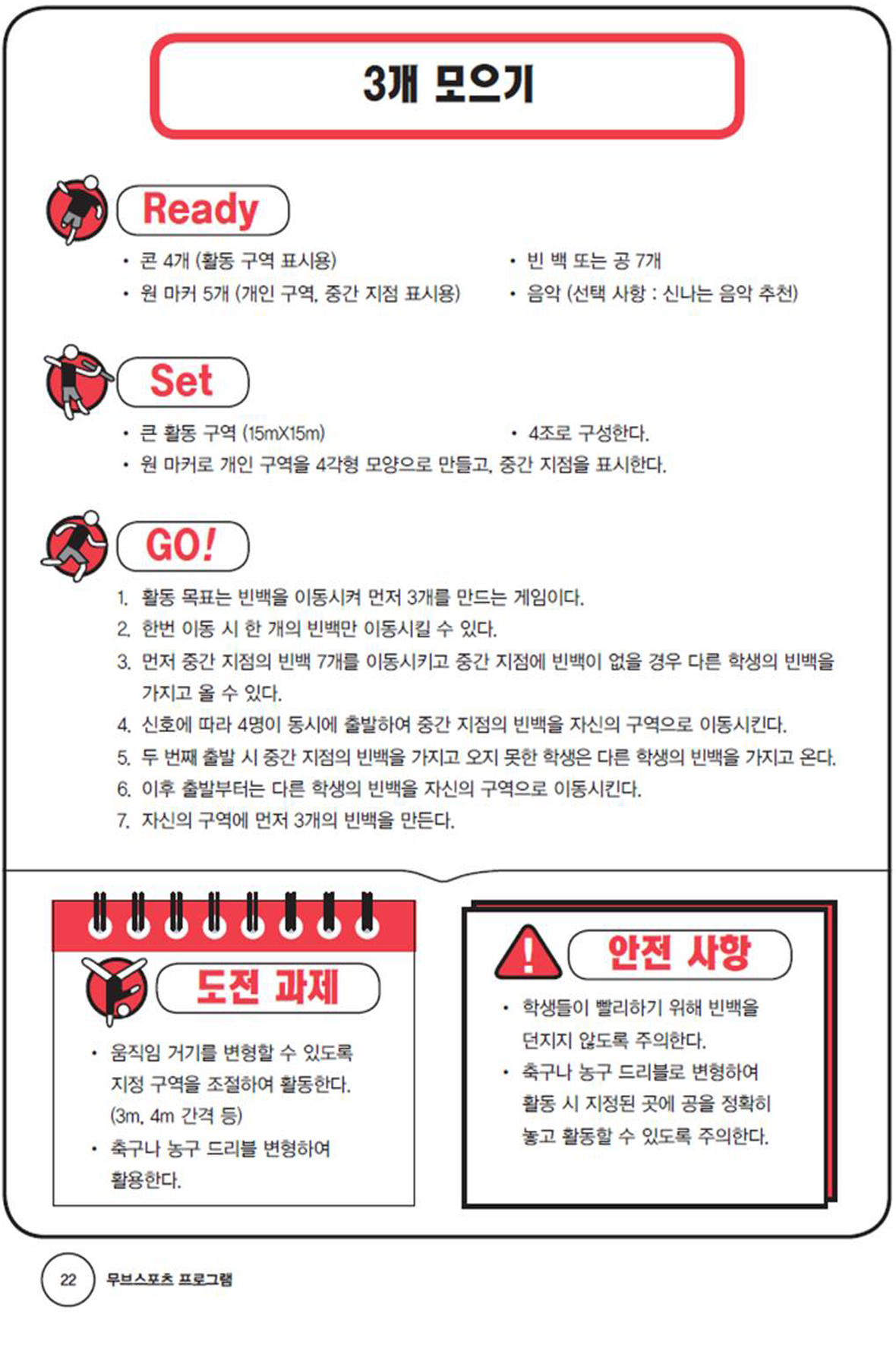 리드업 게임은 다양한 신체활동을 도전/협동/경쟁 요소를 포함한 활동으로 학생들이 짧은 시간에 쉽고 즐겁게 참여 가능한 준비운동 게임입니다.