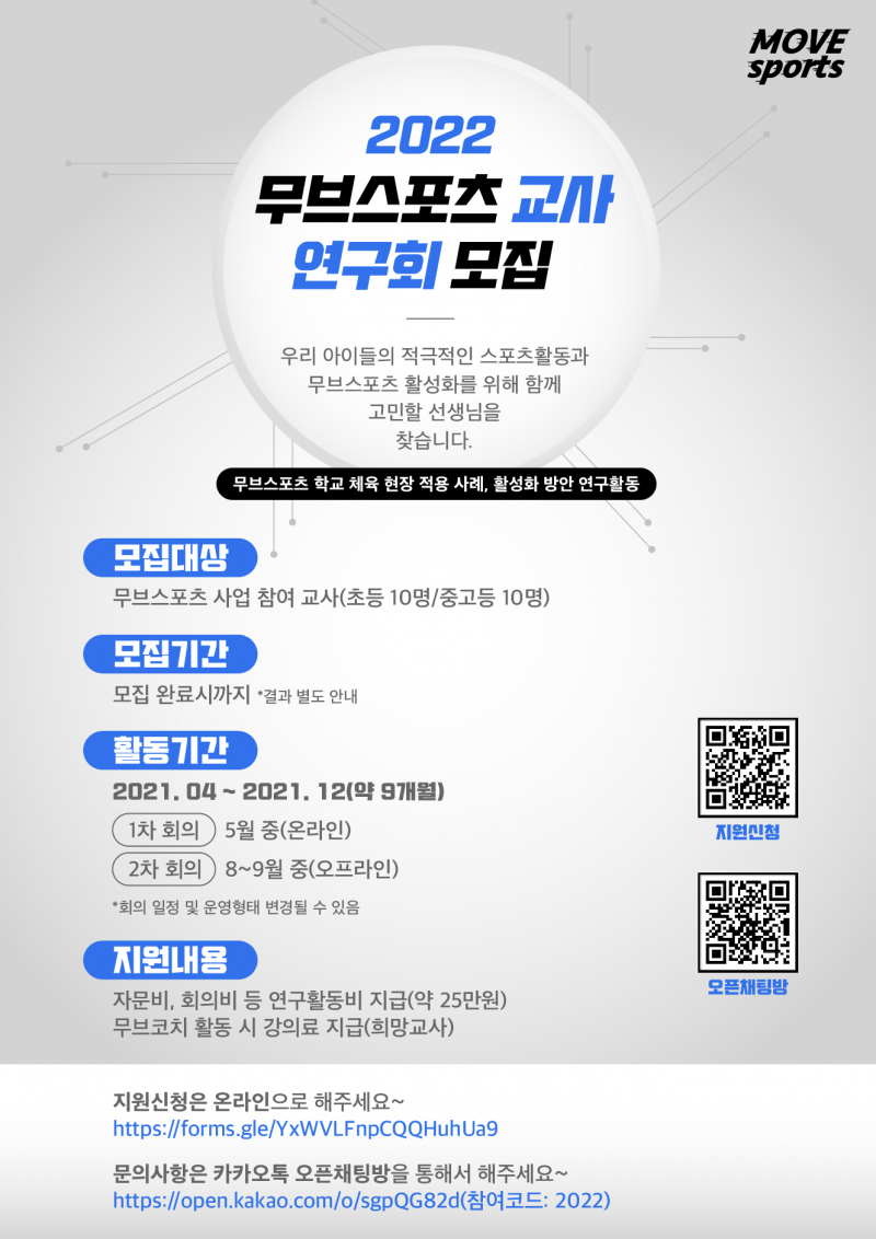 - 모집대상: 무브스포츠 사업 참여 교사(초등10명 / 중고등 10명)