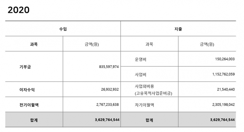 (재공시) 2020 연간 기부금 모금액 및 활용실적 명세서