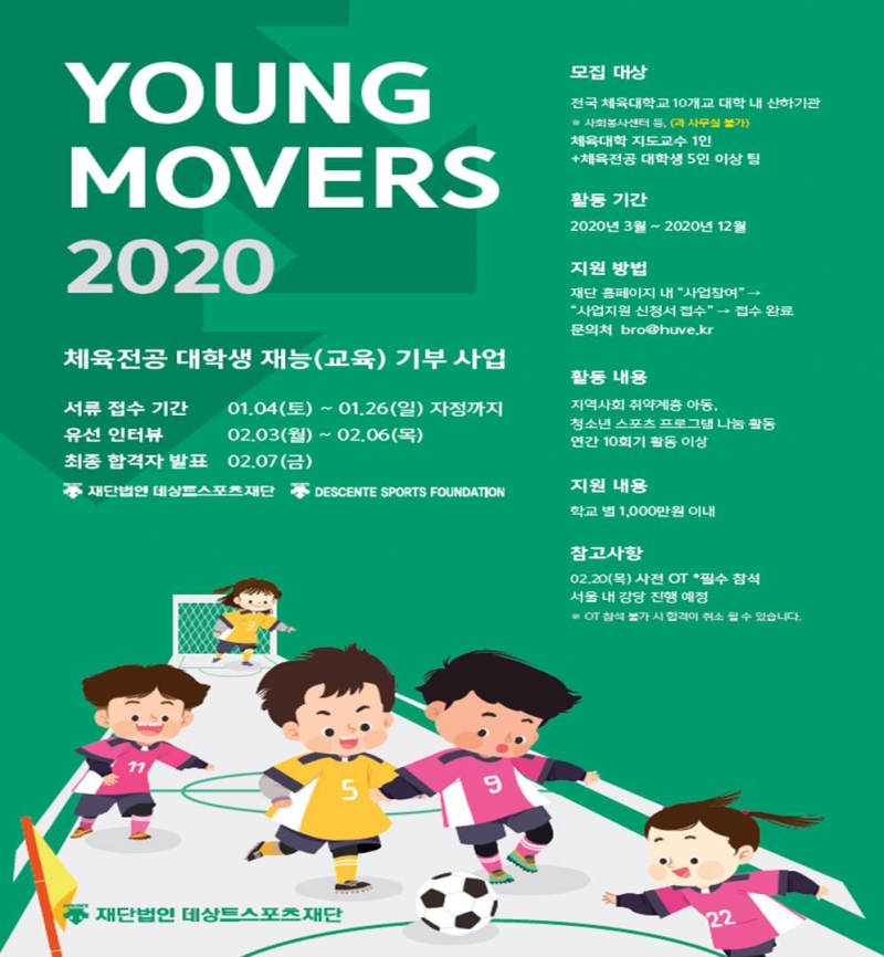스포츠 체험 기회를 제공하였다. 영 무버스에 선정된 학교에는 최대 1 천만 원의 활동비와 활동조끼를 지원하며 지역 아동, 청소년 500명 이상이 수혜 받을 수